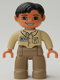 Duplo Figure Lego Ville, Male, Dark Tan Legs, Tan Top, Black Hair, Brown Eyes (Zoo Keeper) is a LEGO minifigure that appeared in the Zoo , Giant Zoo , Friendly Zoo , Zoo Vehicles , Zoo Animals - Zookeeper , Feeding Zoo , Big City Zoo , My First Zoo , Fun Zoo , Community Transport Set and Community People sets.