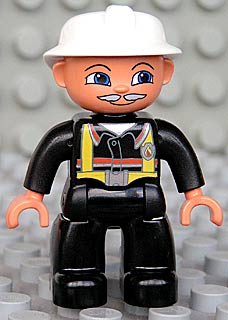 Duplo Figure Lego Ville, Male Fireman, Black Legs, Nougat Hands, White Helmet, Light Gray Moustache is a LEGO minifigure that appeared in the Fire Boat , Fire Station , Identity and Landscape Kit , Fire Station , Fire Truck , Fire Car , Fire Station , Fire Chief and Fire Rescue Services Set sets.