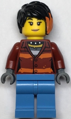 Police Crook, Female - Daisy Kaboom Dark Red Torso with Orange Stripes. and Bright Light Blue Legs is a LEGO minifigure that appeared in the Police Station set which was released in January 2022.